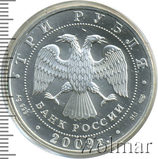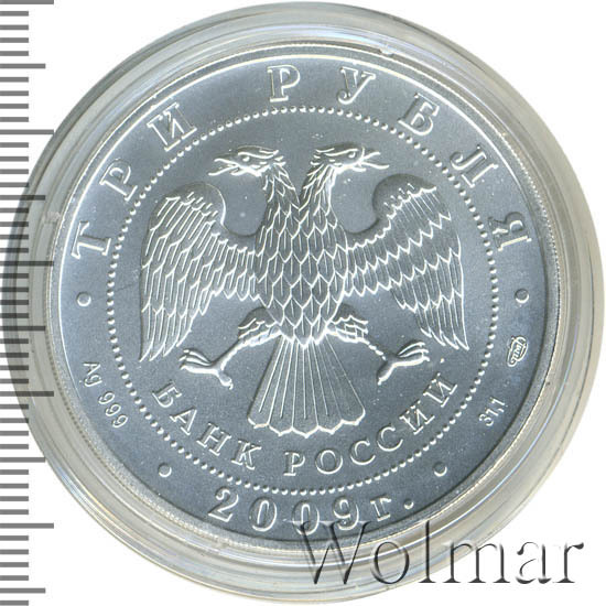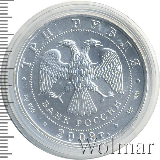 Вверху вдоль канта номинал «ТРИ РУБЛЯ», внизу слева химическое название «Ag» и проба «999» металла, внизу по центру год выпуска «2009 г.», внизу справа чистый вес находящегося в монете драгоценного металла «31,10» и монограмма монетного двора «СПМД». В середине в ободке из точек двуглавый орел под ним с внутренней стороны точечного ободка слова «БАНК РОССИИ».