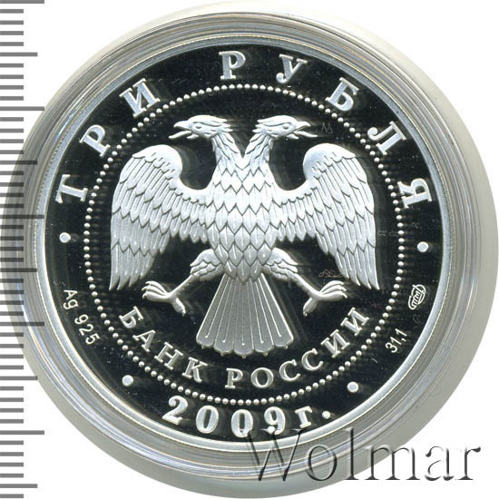 Вверху вдоль канта номинал «ТРИ РУБЛЯ», внизу слева химическое название «Ag» и проба «925» металла, внизу по центру год выпуска «2009 г.», внизу справа чистый вес находящегося в монете драгоценного металла «31,10» и монограмма монетного двора «СПМД». В середине в ободке из точек двуглавый орел под ним с внутренней стороны точечного ободка слова «БАНК РОССИИ».