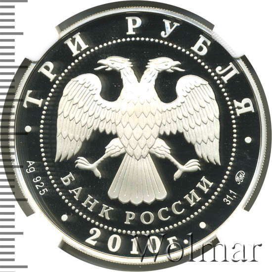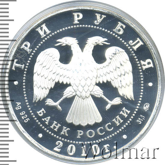 Вверху вдоль канта номинал «ТРИ РУБЛЯ», внизу слева химическое название «Ag» и проба «925» металла, внизу по центру год выпуска «2010 г.», внизу справа чистый вес находящегося в монете драгоценного металла «31,10» и монограмма монетного двора «ММД». В середине в ободке из точек двуглавый орел под ним с внутренней стороны точечного ободка слова «БАНК РОССИИ».
