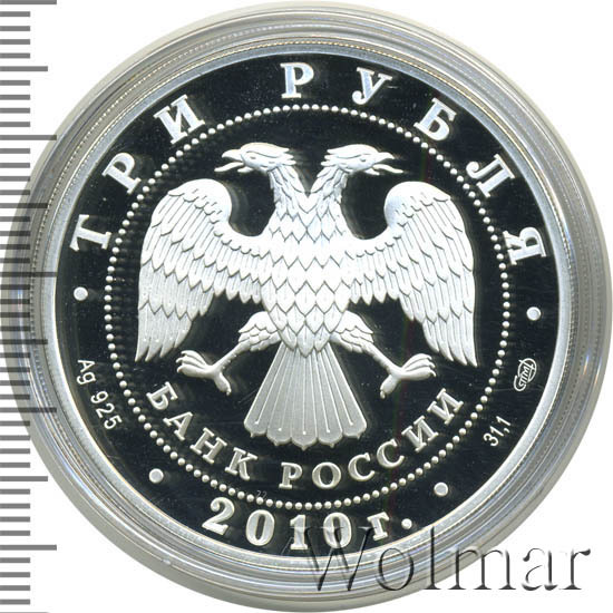 Вверху вдоль канта номинал «ТРИ РУБЛЯ», внизу слева химическое название «Ag» и проба «925» металла, внизу по центру год выпуска «2010 г.», внизу справа чистый вес находящегося в монете драгоценного металла «31,10» и монограмма монетного двора «СПМД». В середине в ободке из точек двуглавый орел под ним с внутренней стороны точечного ободка слова «БАНК РОССИИ».