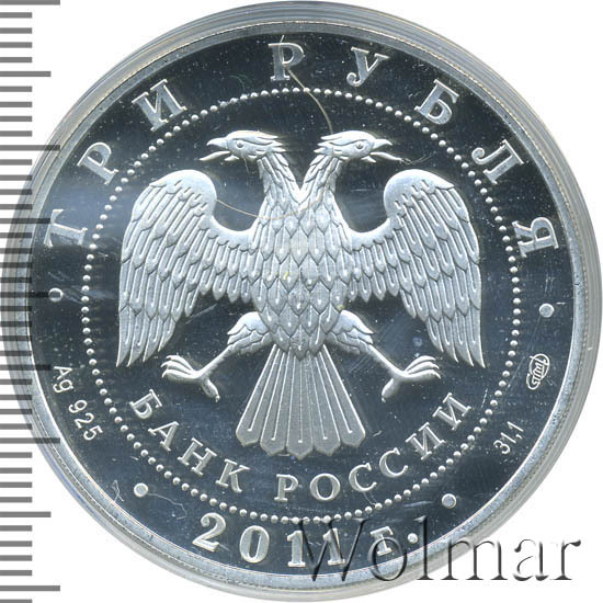 Вверху вдоль канта номинал «ТРИ РУБЛЯ», внизу слева химическое название «Ag» и проба «925» металла, внизу по центру год выпуска «2011 г.», внизу справа чистый вес находящегося в монете драгоценного металла «31,10» и монограмма монетного двора «СПМД». В середине в ободке из точек двуглавый орел под ним с внутренней стороны точечного ободка слова «БАНК РОССИИ».