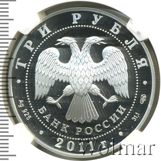 Вверху вдоль канта номинал «ТРИ РУБЛЯ», внизу слева химическое название «Ag» и проба «925» металла, внизу по центру год выпуска «2011 г.», внизу справа чистый вес находящегося в монете драгоценного металла «31,10» и монограмма монетного двора «СПМД». В середине в ободке из точек двуглавый орел под ним с внутренней стороны точечного ободка слова «БАНК РОССИИ».