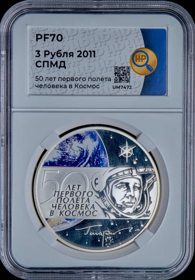 3 рубля. 50 лет первого полета человека в космосбуквы СПМД Аукцион: Wolmar VIP Состояние: PF 70 ULTRA CAMEO | 08.05.2025 |