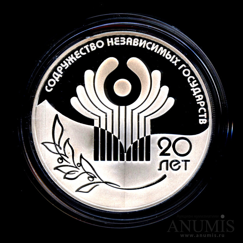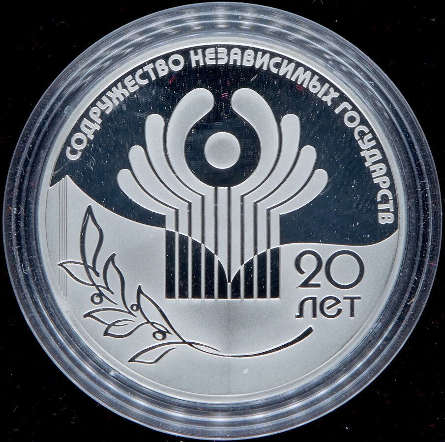 В центре, на верхнем зеркальном участке диска монеты и частично на нижнем матовом участке - эмблема СНГ, над ней вдоль канта - матовая надпись полукругом: "СОДРУЖЕСТВО НЕЗАВИСИМЫХ ГОСУДАРСТВ", на нижнем матовом участке диска, под эмблемой - контурное изображение оливковой ветви, справа - надпись в две строки: "20 ЛЕТ СНГ".