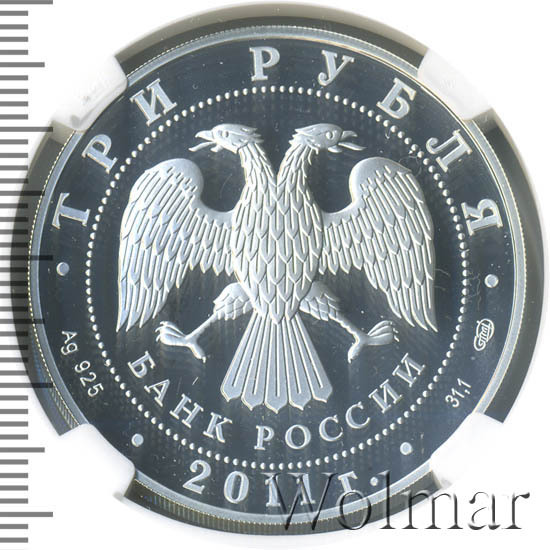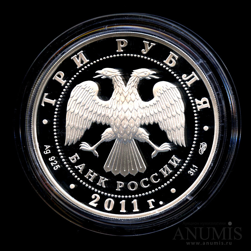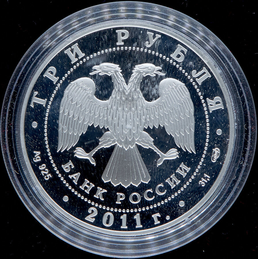 Вверху вдоль канта номинал «ТРИ РУБЛЯ», внизу слева химическое название «Ag» и проба «925» металла, внизу по центру год выпуска «2011 г.», внизу справа чистый вес находящегося в монете драгоценного металла «31,10» и монограмма монетного двора «СПМД». В середине в ободке из точек двуглавый орел под ним с внутренней стороны точечного ободка слова «БАНК РОССИИ».