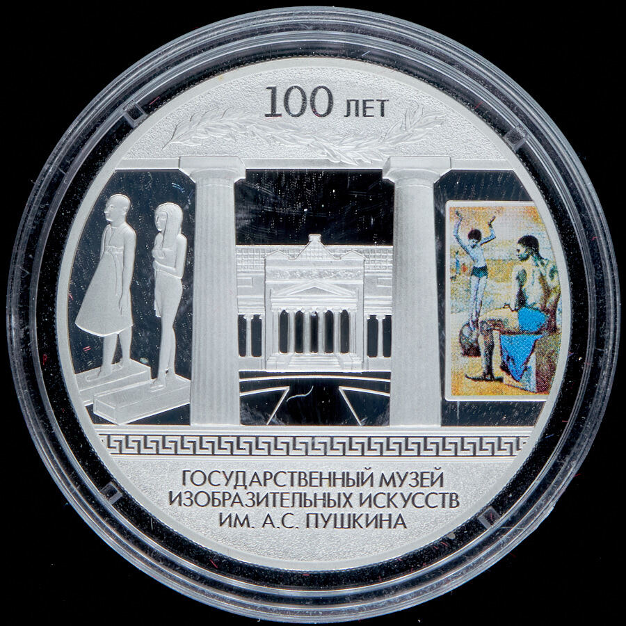 На зеркальном поле центральной части монеты - две колонны, разделяющие его на три просвета, в правом просвете - цветной фрагмент картины П. Пикассо "Девочка на шаре", в центральном просвете между колоннами - рельефное изображение главного фасада здания Государственного музея изобразительных искусств им. А.С. Пушкина в Москве, в левом просвете - древнеегипетские скульптуры жрецов бога Амона Аменхотепа и Раннаи, вверху, на матовой поверхности стены, опирающейся на колонны - надпись: "100 ЛЕТ", под ней пальмовая ветвь, в нижней части диска, на матовом сегменте, обрамленном по верхней кромке геометрическим орнаментом - надпись в три строки: "ГОСУДАРСТВЕННЫЙ МУЗЕЙ ИЗОБРАЗИТЕЛЬНЫХ ИСКУССТВ ИМ. А.С. ПУШКИНА".