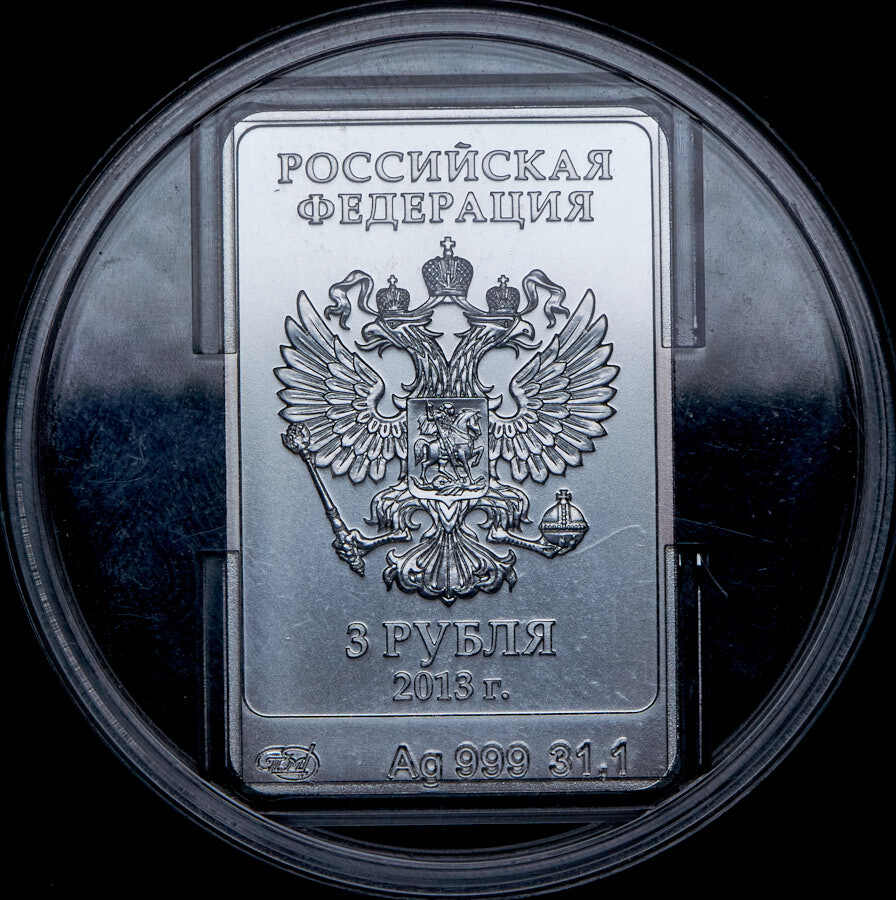 В середине прямоугольника со скругленными углами орел со скипетром и державой с Государственного герба Российской Федерации, над ним слова «РОССИЙСКАЯ ФЕДЕРАЦИЯ», под орлом обозначение достоинства монеты «3 рубля» и год чеканки «2013 г.». Внизу под прямоугольником у края монеты монограмма монетного двора «СПМД», химическое название «Ag» и проба «999» металла, чистый вес находящегося в монете драгоценного металла «31,1».