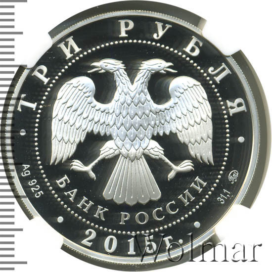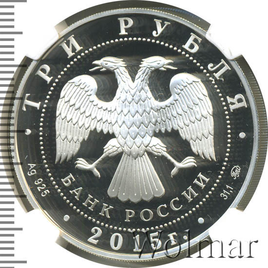 В центре – эмблема Банка России (двуглавый орёл с опущенными крыльями, под ним – надпись полукругом "БАНК РОССИИ"), обрамленная кругом из точек и надписями по кругу – вверху: "ТРИ РУБЛЯ", внизу: слева – обозначения драгоценного металла и пробы сплава, в центре – год выпуска "2015 г.", справа – содержание химически чистого металла и товарный знак монетного двора.
