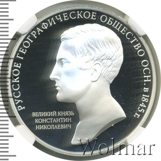В центре диска на зеркальном поле – профильный портрет великого князя Константина Николаевича, слева от него внизу – надпись в три строки: "ВЕЛИКИЙ КНЯЗЬ КОНСТАНТИН НИКОЛАЕВИЧ", вверху – надпись вдоль канта: "РУССКОЕ ГЕОГРАФИЧЕСКОЕ ОБЩЕСТВО ОСН. в 1845 г.".