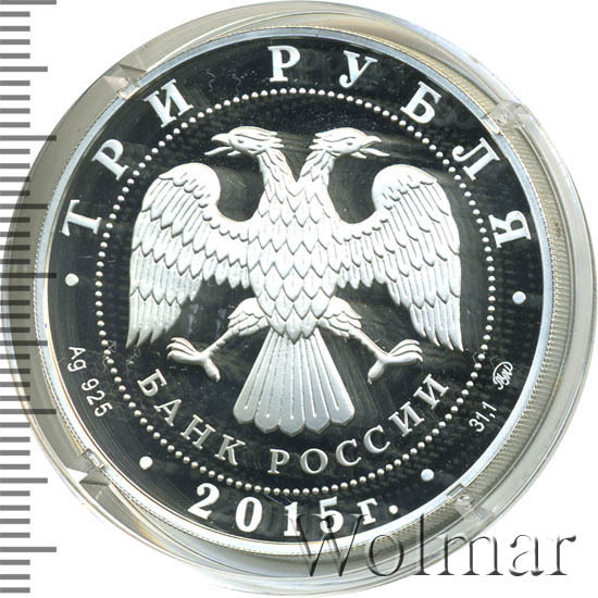 В центре – эмблема Банка России (двуглавый орёл с опущенными крыльями, под ним – надпись полукругом "БАНК РОССИИ"), обрамленная кругом из точек и надписями по кругу – вверху: "ТРИ РУБЛЯ", внизу: слева – обозначения драгоценного металла и пробы сплава, в центре – дата выпуска "2015 г.", справа – содержание химически чистого металла и товарный знак монетного двора.