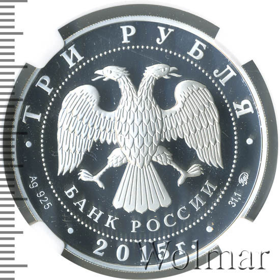 В центре – эмблема Банка России (двуглавый орёл с опущенными крыльями, под ним – надпись полукругом "БАНК РОССИИ"), обрамленная кругом из точек и надписями по кругу – вверху: "ТРИ РУБЛЯ", внизу: слева – обозначения драгоценного металла и пробы сплава, в центре – дата выпуска "2015 г.", справа – содержание химически чистого металла и товарный знак монетного двора.