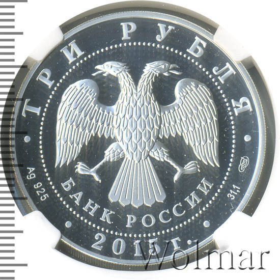 В центре – эмблема Банка России (двуглавый орёл с опущенными крыльями, под ним – надпись полукругом "БАНК РОССИИ"), обрамленная кругом из точек и надписями по кругу – вверху: "ТРИ РУБЛЯ", внизу: слева – обозначения драгоценного металла и пробы сплава, в центре – год выпуска "2015 г.", справа – содержание химически чистого металла и товарный знак монетного двора.