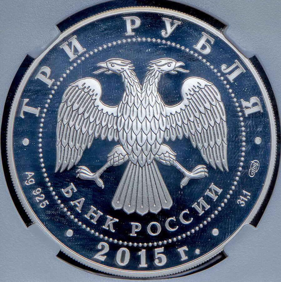 В центре – эмблема Банка России (двуглавый орёл с опущенными крыльями, под ним – надпись полукругом "БАНК РОССИИ"), обрамленная кругом из точек и надписями по кругу – вверху: "ТРИ РУБЛЯ", внизу: слева – обозначения драгоценного металла и пробы сплава, в центре – дата выпуска "2015 г.", справа – содержание химически чистого металла и товарный знак монетного двора.