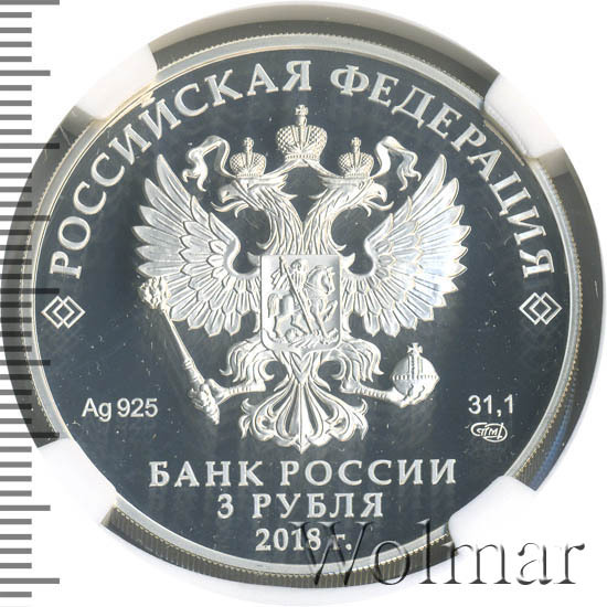 Рельефное изображение Государственного герба Российской Федерации, над ним вдоль канта – надпись полукругом: "РОССИЙСКАЯ ФЕДЕРАЦИЯ", обрамленная с обеих сторон сдвоенными ромбами, внизу под гербом: слева – обозначения драгоценного металла и пробы сплава, справа – содержание химически чистого металла и товарный знак Санкт-Петербургского монетного двора, внизу в центре в три строки – надпись: "БАНК РОССИИ", номинал монеты: "3 РУБЛЯ", год выпуска: "2018 г.".