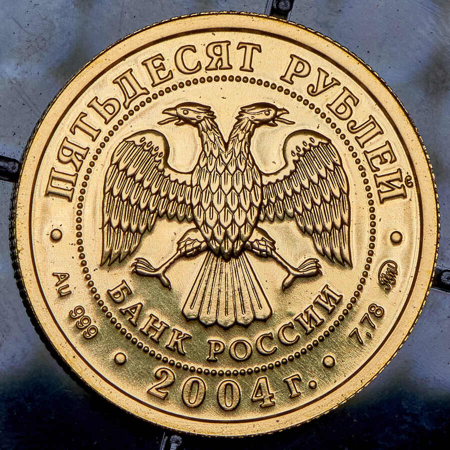 Вверху вдоль канта номинал «ПЯТЬДЕСЯТ РУБЛЕЙ», внизу слева химическое название «Au» и проба «999» металла, внизу по центру год выпуска «2004 г.», внизу справа чистый вес находящегося в монете драгоценного металла «7,78» и монограмма монетного двора «ММД». В середине в ободке из точек двуглавый орел под ним с внутренней стороны точечного ободка слова «БАНК РОССИИ».