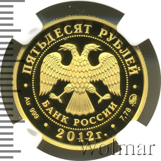 Вверху вдоль канта номинал «ПЯТЬДЕСЯТ РУБЛЕЙ», внизу слева химическое название «Au» и проба «999» металла, внизу по центру год выпуска «2012 г.», внизу справа чистый вес находящегося в монете драгоценного металла «7,78» и монограмма монетного двора «ММД». В середине в ободке из точек двуглавый орел под ним с внутренней стороны точечного ободка слова «БАНК РОССИИ».