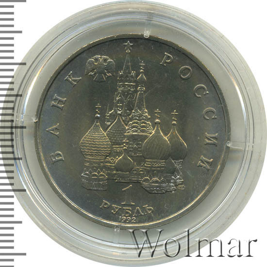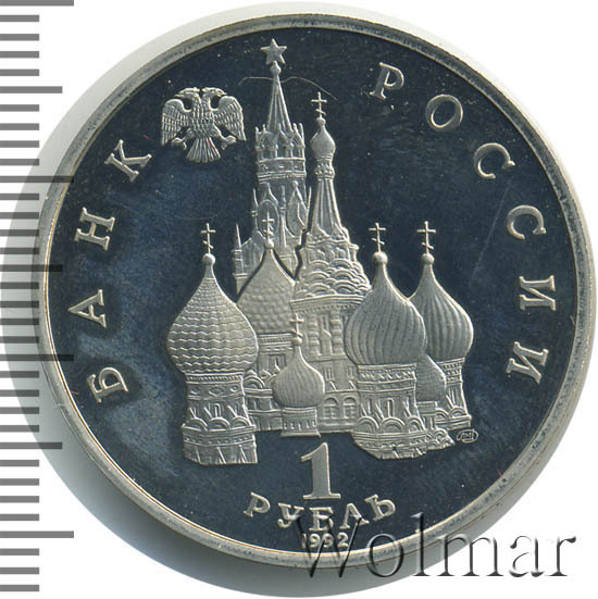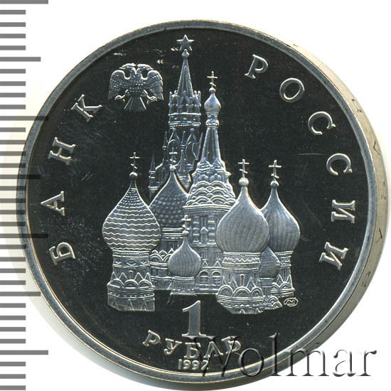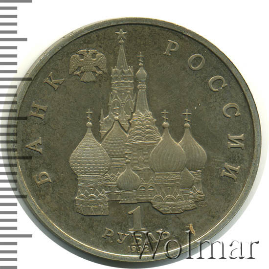Сверху влево небольшое изображение двухглавого орла, слева слово «БАНК», справа «РОССИИ», внизу обозначение достоинства монеты - цифра «1» под ним слово «рубль», ниже год выпуска монеты «1992», в середине Собор Покрова Пресвятой Богородицы (собор Василия Блаженного) и за ним Спасская башня Московского Кремлля, чуть ниже и правее монограмма монетного двора «ЛМД».