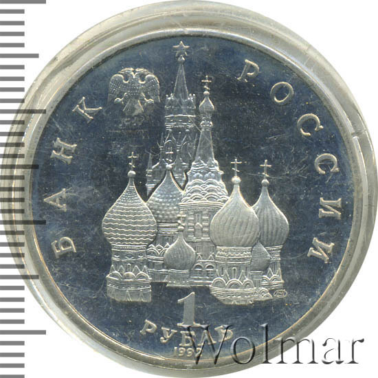 Сверху влево небольшое изображение двухглавого орла, слева слово «БАНК», справа «РОССИИ», внизу обозначение достоинства монеты - цифра «1» под ним слово «рубль», ниже год выпуска монеты «1992», в середине Собор Покрова Пресвятой Богородицы (собор Василия Блаженного) и за ним Спасская башня Московского Кремлля, чуть ниже и правее монограмма монетного двора «ЛМД».