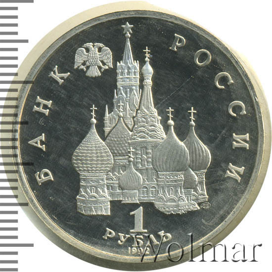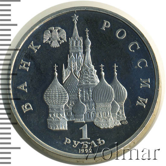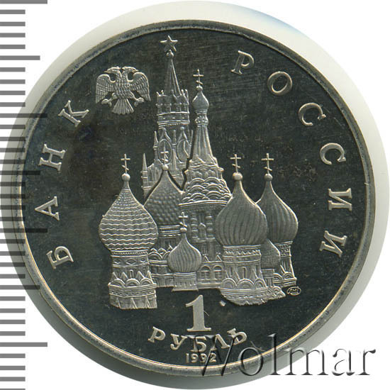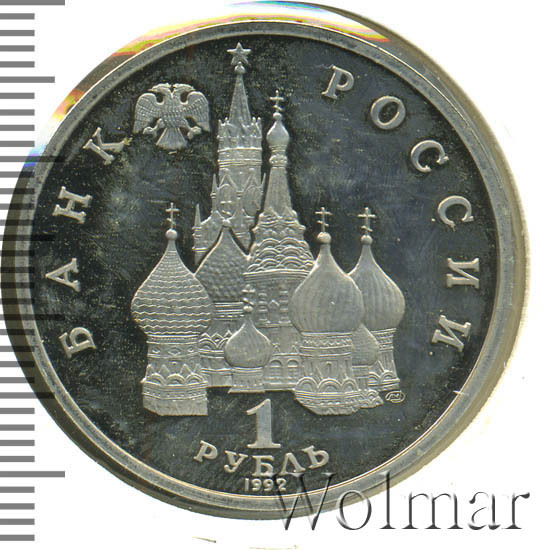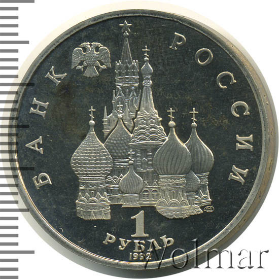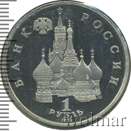 Сверху влево небольшое изображение двухглавого орла, слева слово «БАНК», справа «РОССИИ», внизу обозначение достоинства монеты - цифра «1» под ним слово «рубль», ниже год выпуска монеты «1992», в середине Собор Покрова Пресвятой Богородицы (собор Василия Блаженного) и за ним Спасская башня Московского Кремлля, чуть ниже и правее монограмма монетного двора «ЛМД».