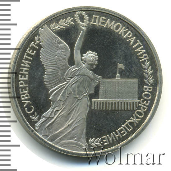 Скульптурное изображение богини Победы с венком в руке на фоне Дома Советов Российской Федерации в Москве, по окружности - надписи: "СУВЕРЕНИТЕТ", "ДЕМОКРАТИЯ", "ВОЗРОЖДЕНИЕ", разделённые лавровыми ветвями.