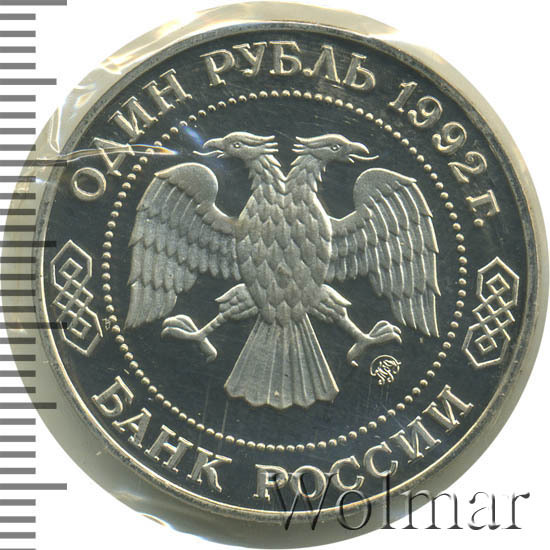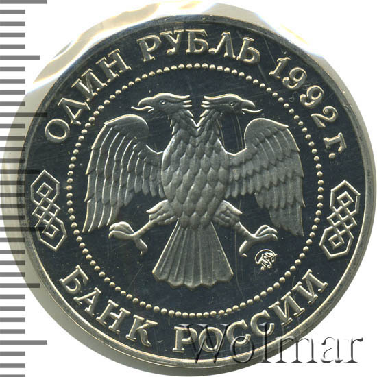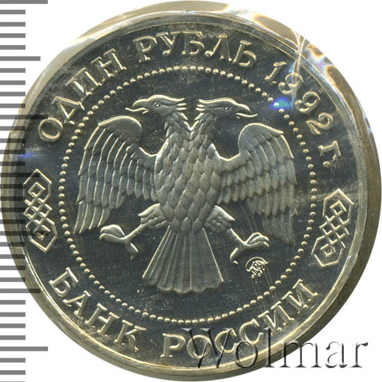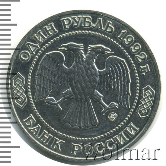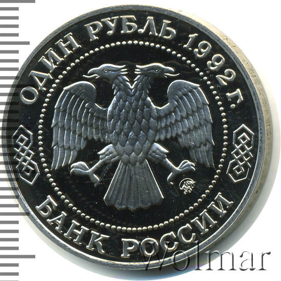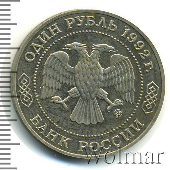 Вверху вдоль канта номинал «ОДИН РУБЛЬ» и год выпуска «1992 г.», внизу слова «БАНК РОССИИ». В середине двуглавый орел под ним справа монограмма монетного двора «ММД».