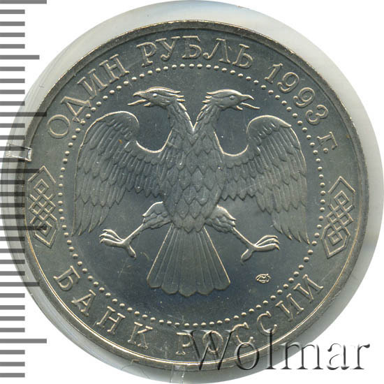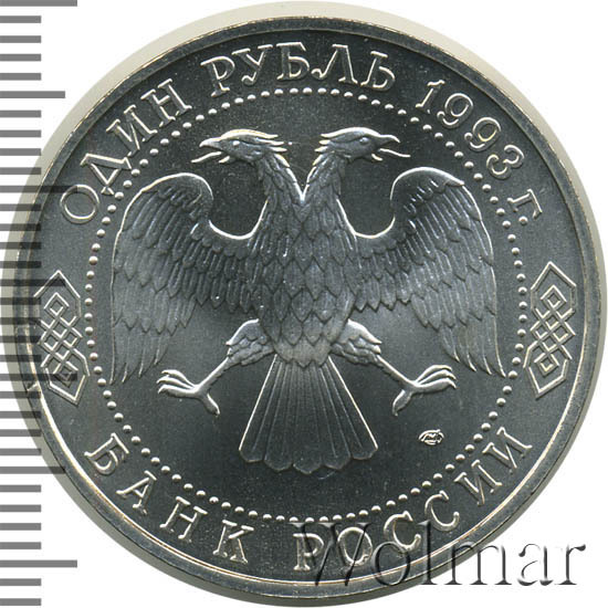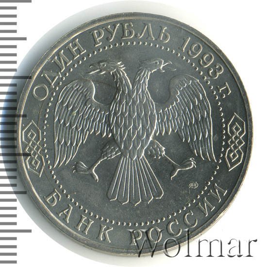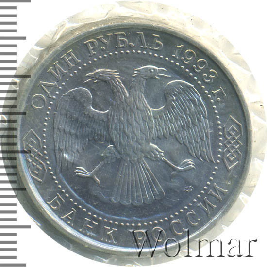 Вверху вдоль канта номинал «ОДИН РУБЛЬ» и год выпуска «1993 г.», внизу слова «БАНК РОССИИ». В середине двуглавый орел под ним справа монограмма монетного двора «ЛМД».