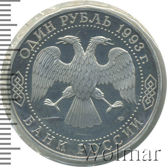 Вверху вдоль канта номинал «ОДИН РУБЛЬ» и год выпуска «1993 г.», внизу слова «БАНК РОССИИ». В середине двуглавый орел под ним справа монограмма монетного двора «ЛМД».