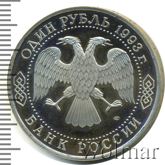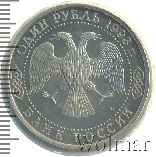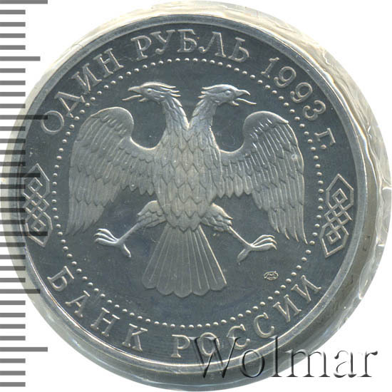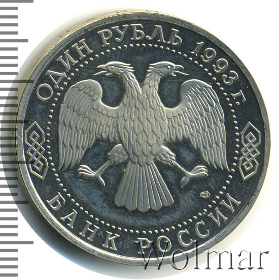 Вверху вдоль канта номинал «ОДИН РУБЛЬ» и год выпуска «1993 г.», внизу слова «БАНК РОССИИ». В середине двуглавый орел под ним справа монограмма монетного двора «ЛМД».