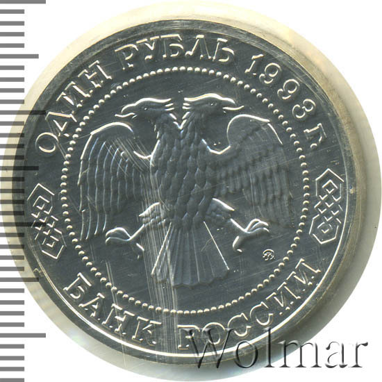 Вверху вдоль канта номинал «ОДИН РУБЛЬ» и год выпуска «1993 г.», внизу слова «БАНК РОССИИ». В середине двуглавый орел под ним справа монограмма монетного двора «ММД».