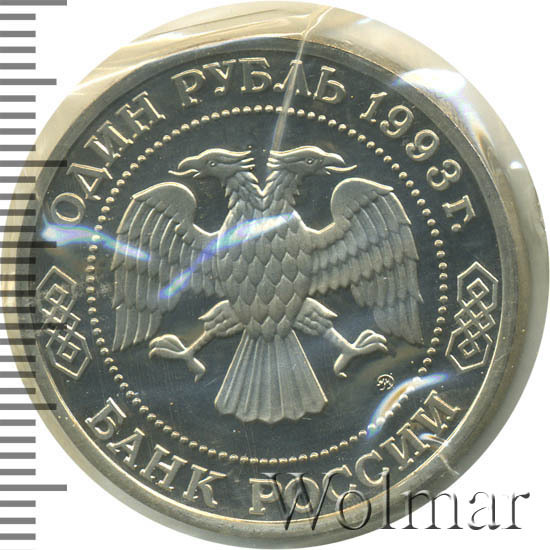 Вверху вдоль канта номинал «ОДИН РУБЛЬ» и год выпуска «1993 г.», внизу слова «БАНК РОССИИ». В середине двуглавый орел под ним справа монограмма монетного двора «ММД».