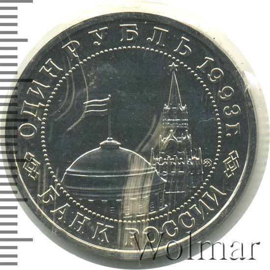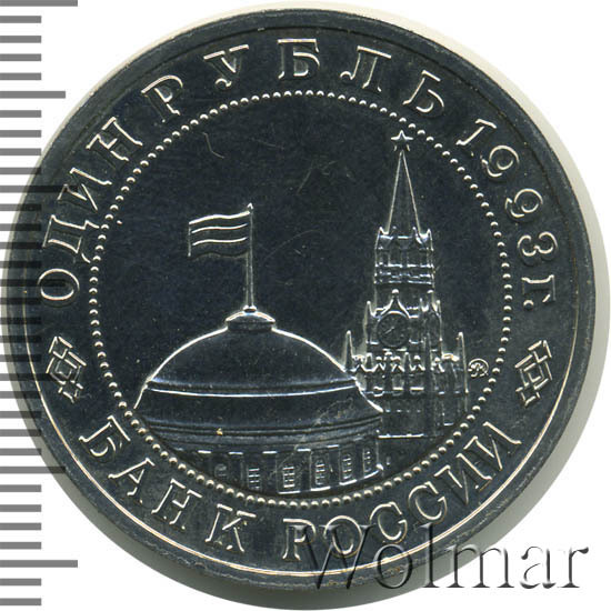 Вверху вдоль канта номинал «ОДИН РУБЛЬ» и год выпуска «1993 г.», внизу слова «БАНК РОССИИ». В середине в ободке из точек изображение Спасской башни Московского Кремля и частично перекрывающего ее купола Сенатского дворца с развевающимся флагом, с внутренней стороны точечного ободка справа монограмма монетного двора «ММД».