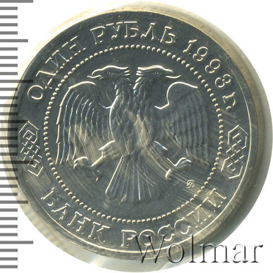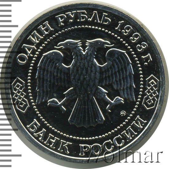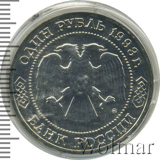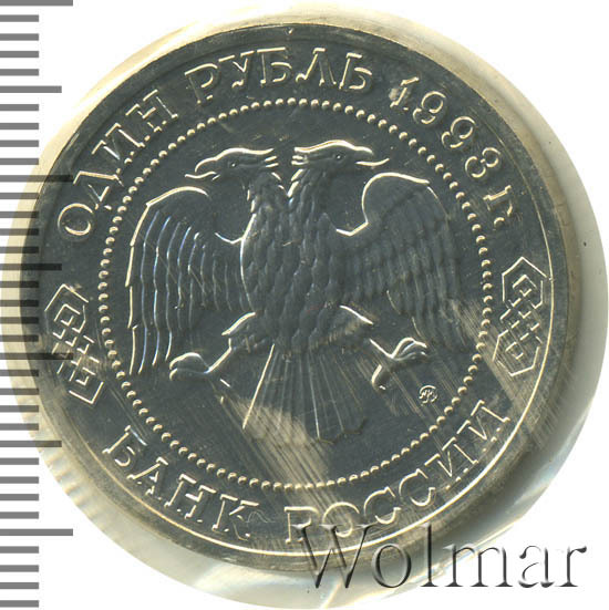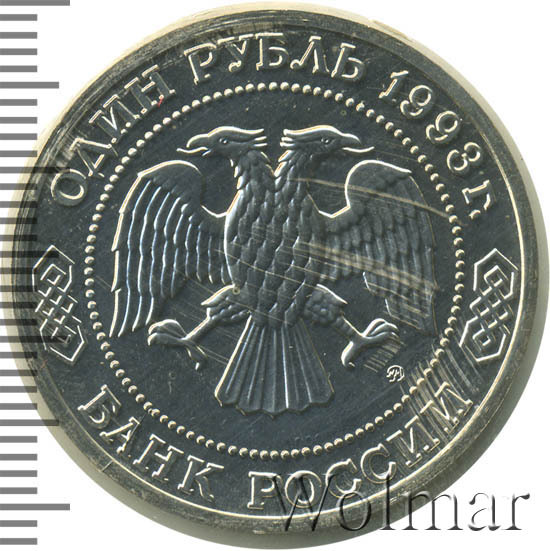 Вверху вдоль канта номинал «ОДИН РУБЛЬ» и год выпуска «1993 г.», внизу слова «БАНК РОССИИ». В середине двуглавый орел под ним справа монограмма монетного двора «ММД».