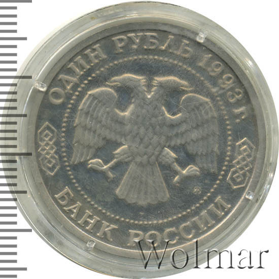Вверху вдоль канта номинал «ОДИН РУБЛЬ» и год выпуска «1993 г.», внизу слова «БАНК РОССИИ». В середине двуглавый орел под ним справа монограмма монетного двора «ММД».