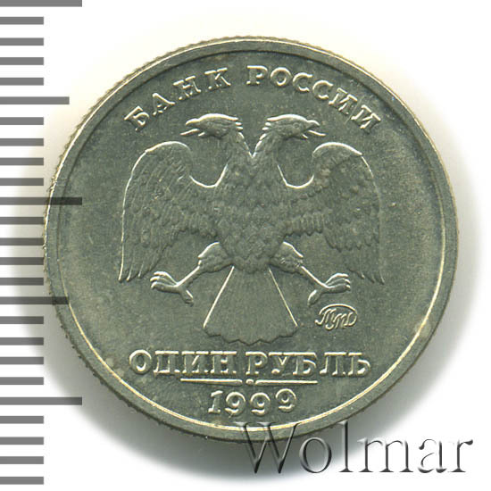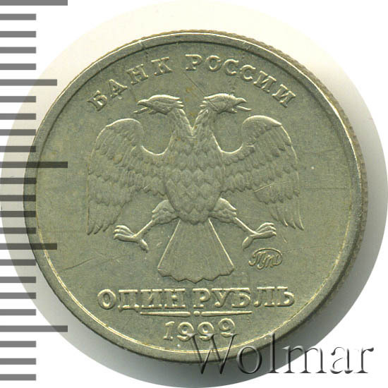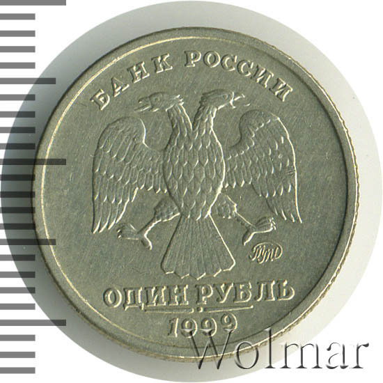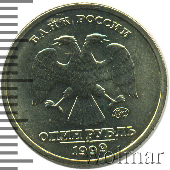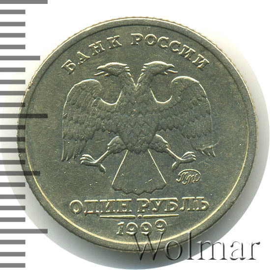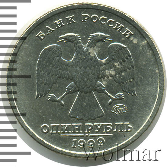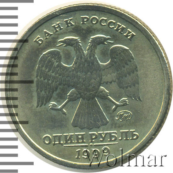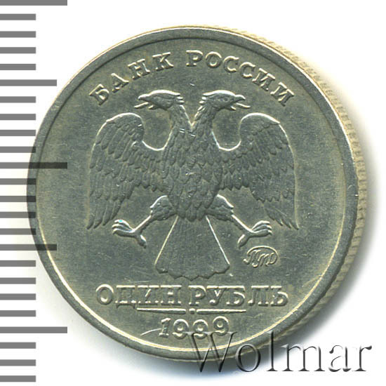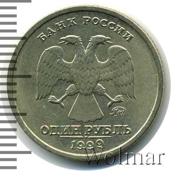 Сверху вдоль выступающего канта слова «БАНК РОССИИ». В середине монеты двуглавый орел, ниже указано достоинство монеты «ОДИН РУБЛЬ». Под левой ногой орла монограмма монетного двора «ММД». Внизу у края монеты год выпуска «1999», над ним две горизонтальные заостренные черты смотрящие в разные стороны, между ними точка.
