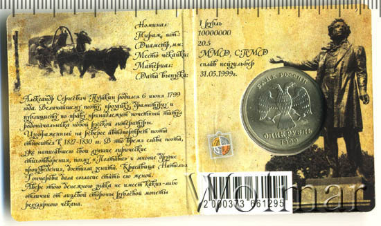 Прочитать подробную информацию об этом рубле 1999 года, а так же о юбилейной монете 1999 года с изображением Пушкина можно в отдельной статье на нашем сайте здесь.