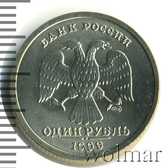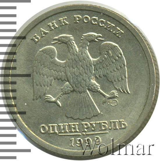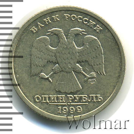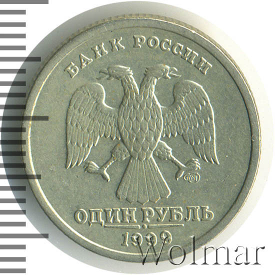 Сверху вдоль выступающего канта слова «БАНК РОССИИ». В середине монеты двуглавый орел, ниже указано достоинство монеты «ОДИН РУБЛЬ». Под левой ногой орла монограмма монетного двора «СПМД». Внизу у края монеты год выпуска «1999», над ним две горизонтальные заостренные черты смотрящие в разные стороны, между ними точка.