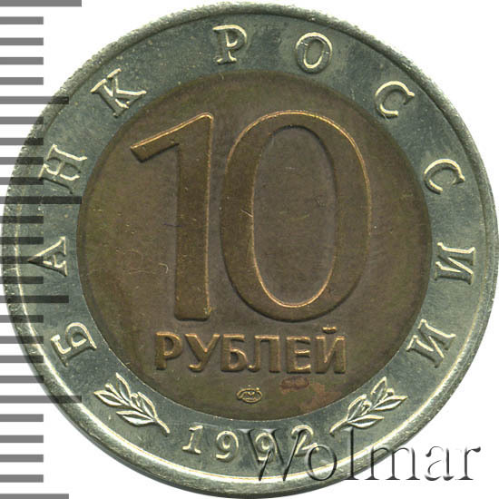 Сверху вдоль края монеты слова «БАНК РОССИИ», внизу год чеканки «1992», в середине номинал «10» под ним слово «РУБЛЕЙ», ниже монограмма монетного двора «ЛМД».