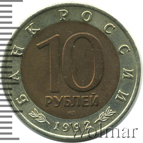 Сверху вдоль края монеты слова «БАНК РОССИИ», внизу год чеканки «1992», в середине номинал «10» под ним слово «РУБЛЕЙ», ниже монограмма монетного двора «ЛМД».