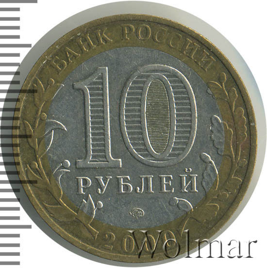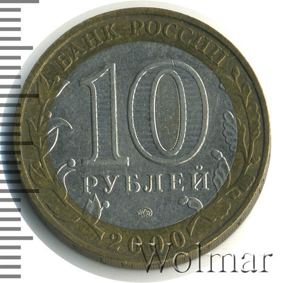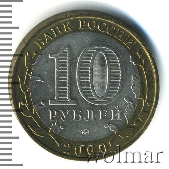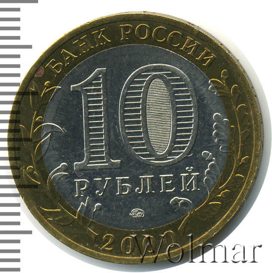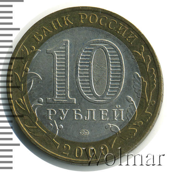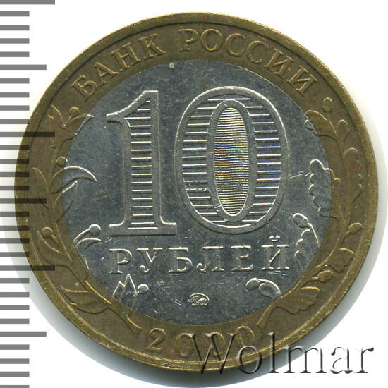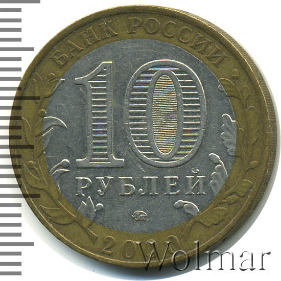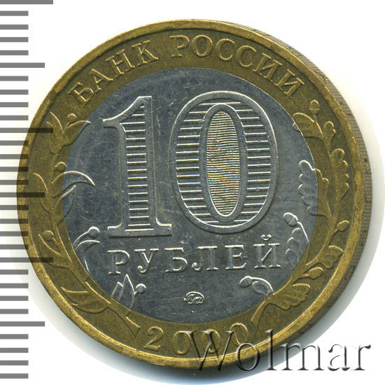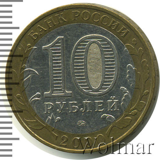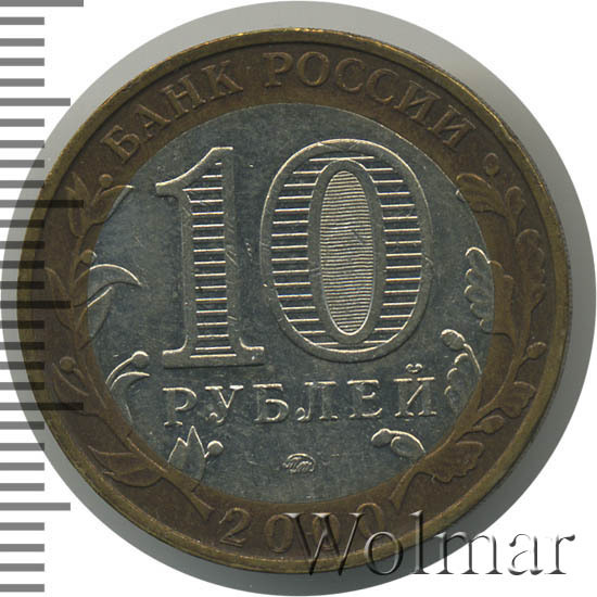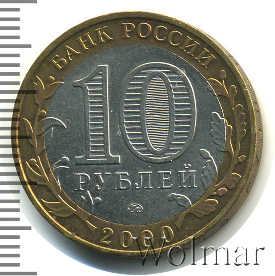 Сверху вдоль края монеты слова «БАНК РОССИИ», внизу год чеканки «2000», слева ветка оливы, справа дуба, обе ветки частично заходят на центральную вставку. В середине номинал «10» под ним слово «РУБЛЕЙ», внутри цифры «0» попеременно видимые при наклоне монеты надписи «10» и «РУБ». Над годом монограмма монетного двора «ММД».