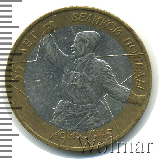 10 рублей. 55-я годовщина Победы в Великой Отечественной войне 1941-1945 ггбуквы ММД Аукцион: Wolmar Standart Состояние: XF+ | 08.10.2025 |