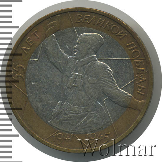 10 рублей. 55-я годовщина Победы в Великой Отечественной войне 1941-1945 ггбуквы ММД Аукцион: Wolmar Standart Состояние: XF+ | 14.01.2026 |