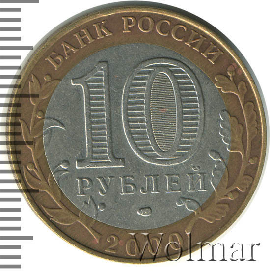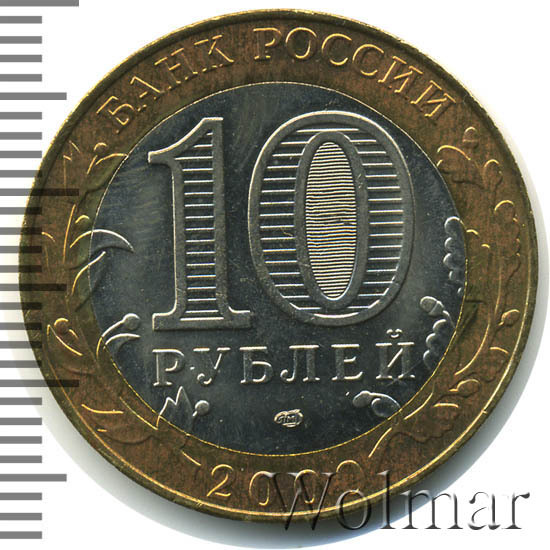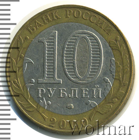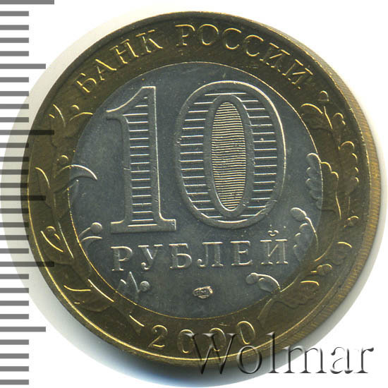 Сверху вдоль края монеты слова «БАНК РОССИИ», внизу год чеканки «2000», слева ветка оливы, справа дуба, обе ветки частично заходят на центральную вставку. В середине номинал «10» под ним слово «РУБЛЕЙ», внутри цифры «0» попеременно видимые при наклоне монеты надписи «10» и «РУБ». Над годом монограмма монетного двора «СПМД».