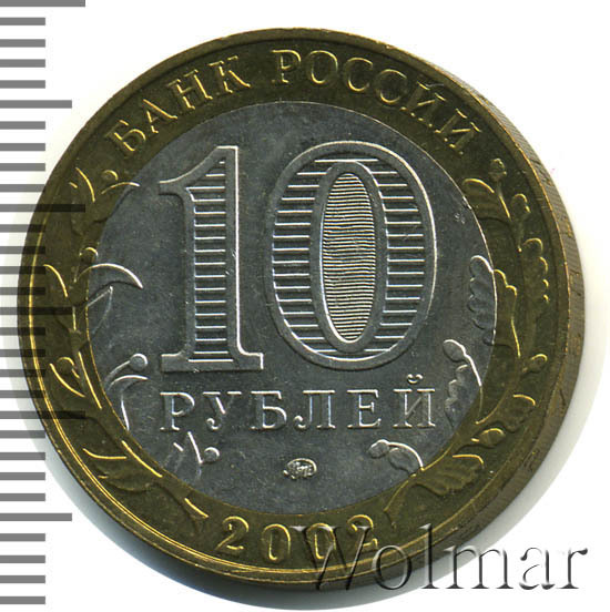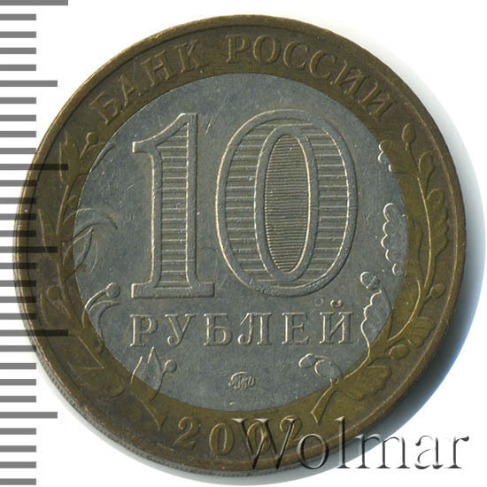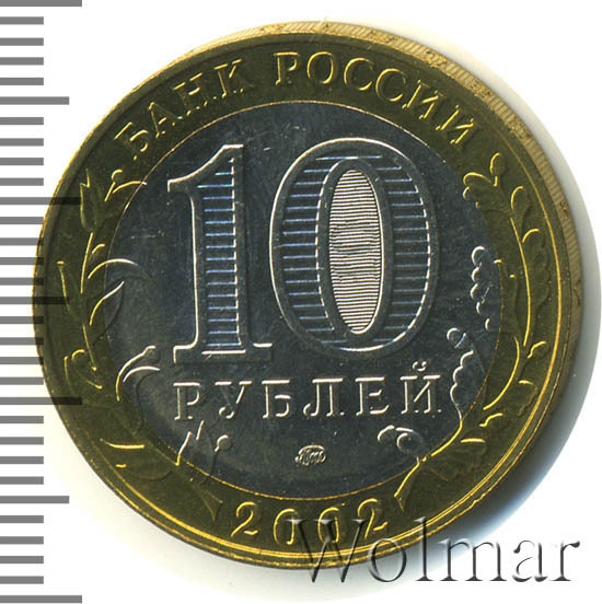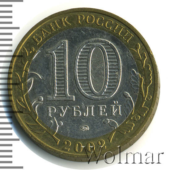 Сверху вдоль края монеты слова «БАНК РОССИИ», внизу год чеканки «2002», слева ветка оливы, справа дуба, обе ветки частично заходят на центральную вставку. В середине номинал «10» под ним слово «РУБЛЕЙ», внутри цифры «0» попеременно видимые при наклоне монеты надписи «10» и «РУБ». Над годом монограмма монетного двора «ММД».