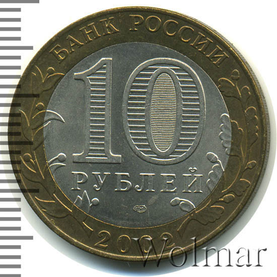Сверху вдоль края монеты слова «БАНК РОССИИ», внизу год чеканки «2002», слева ветка оливы, справа дуба, обе ветки частично заходят на центральную вставку. В середине номинал «10» под ним слово «РУБЛЕЙ», внутри цифры «0» попеременно видимые при наклоне монеты надписи «10» и «РУБ». Над годом монограмма монетного двора «СПМД».