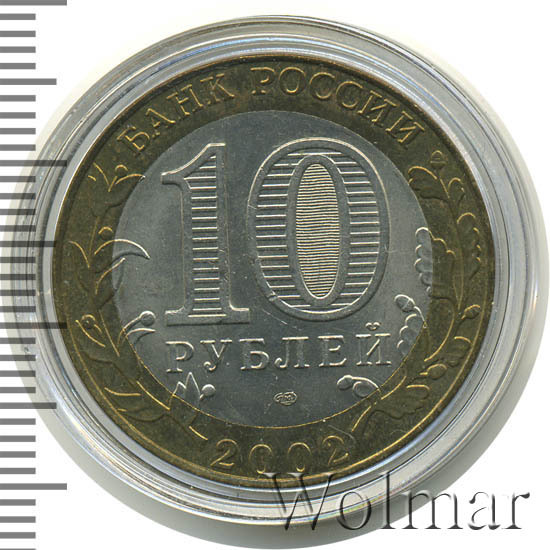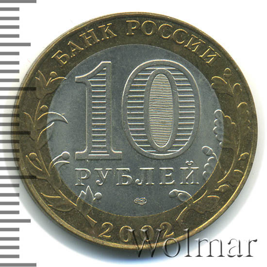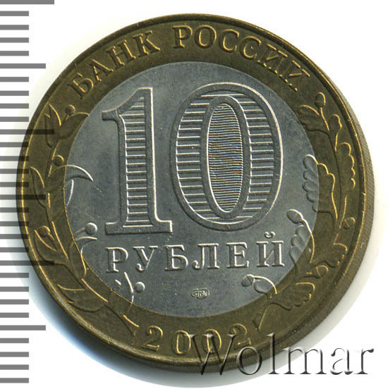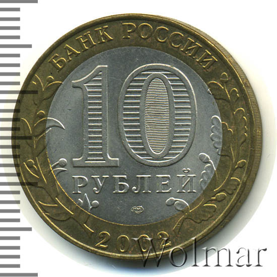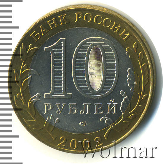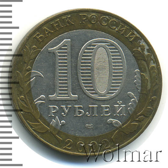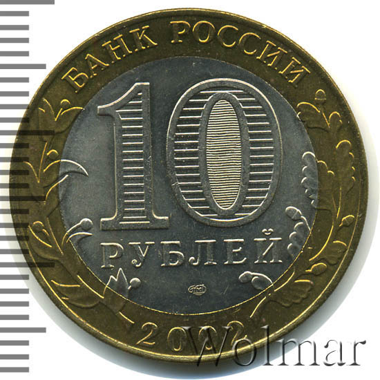Сверху вдоль края монеты слова «БАНК РОССИИ», внизу год чеканки «2002», слева ветка оливы, справа дуба, обе ветки частично заходят на центральную вставку. В середине номинал «10» под ним слово «РУБЛЕЙ», внутри цифры «0» попеременно видимые при наклоне монеты надписи «10» и «РУБ». Над годом монограмма монетного двора «СПМД».
