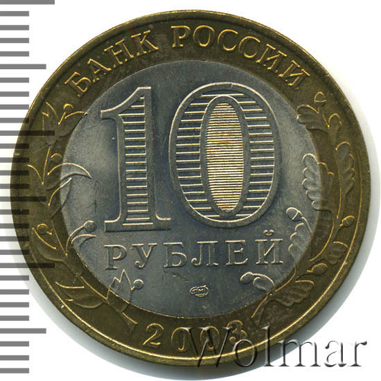 Сверху вдоль края монеты слова «БАНК РОССИИ», внизу год чеканки «2003», слева ветка оливы, справа дуба, обе ветки частично заходят на центральную вставку. В середине номинал «10» под ним слово «РУБЛЕЙ», внутри цифры «0» попеременно видимые при наклоне монеты надписи «10» и «РУБ». Над годом монограмма монетного двора «СПМД».