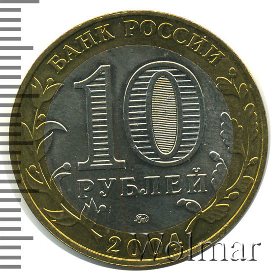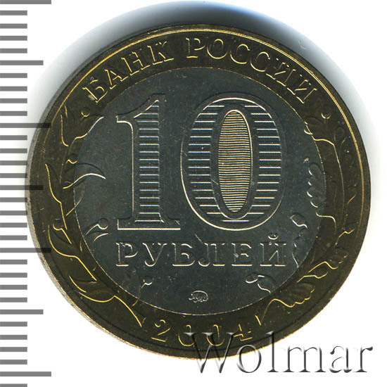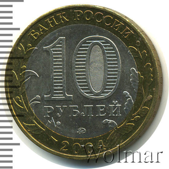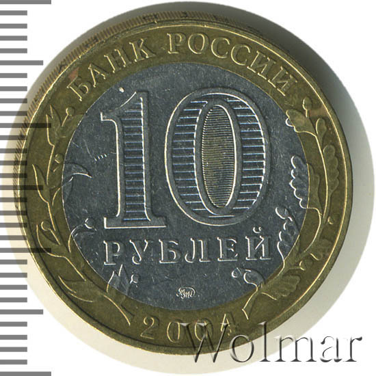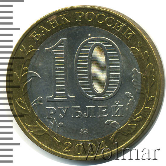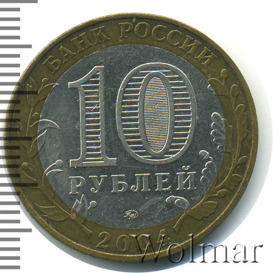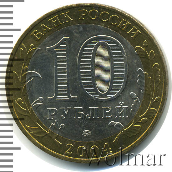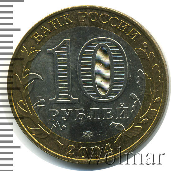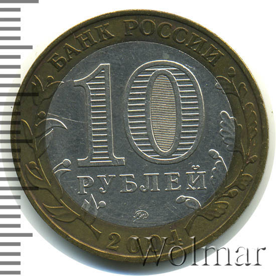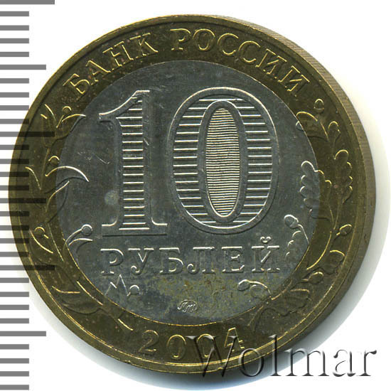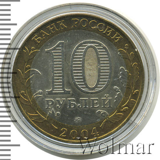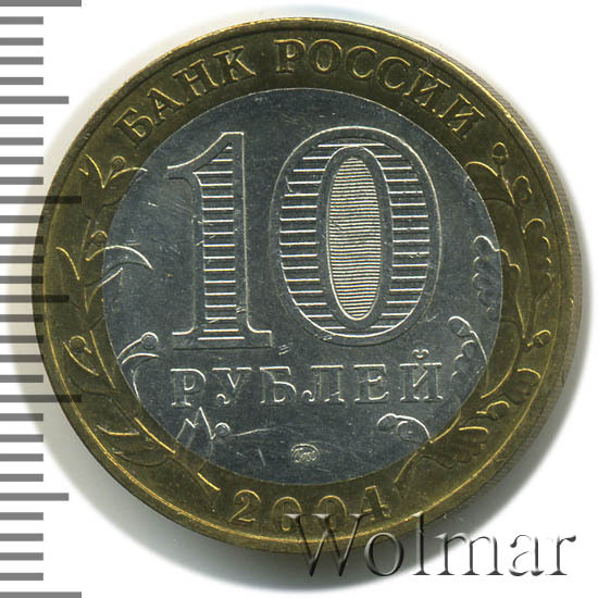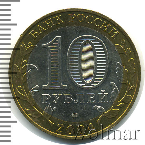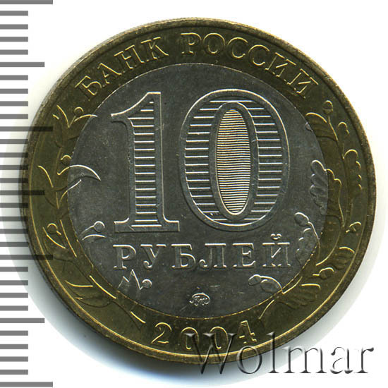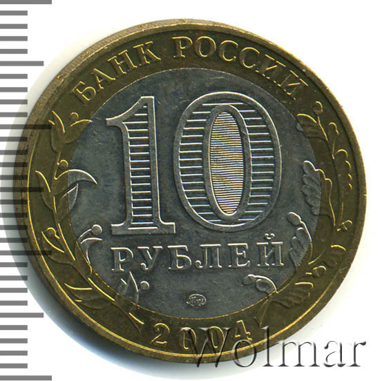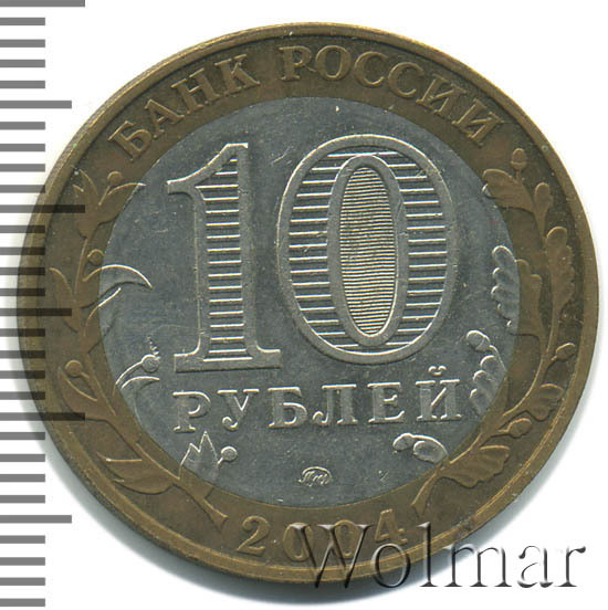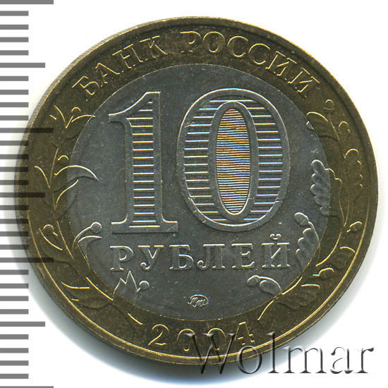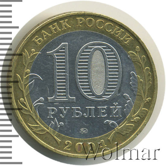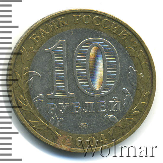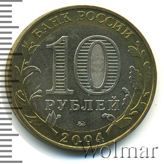 Сверху вдоль края монеты слова «БАНК РОССИИ», внизу год чеканки «2004», слева ветка оливы, справа дуба, обе ветки частично заходят на центральную вставку. В середине номинал «10» под ним слово «РУБЛЕЙ», внутри цифры «0» попеременно видимые при наклоне монеты надписи «10» и «РУБ». Над годом монограмма монетного двора «ММД».