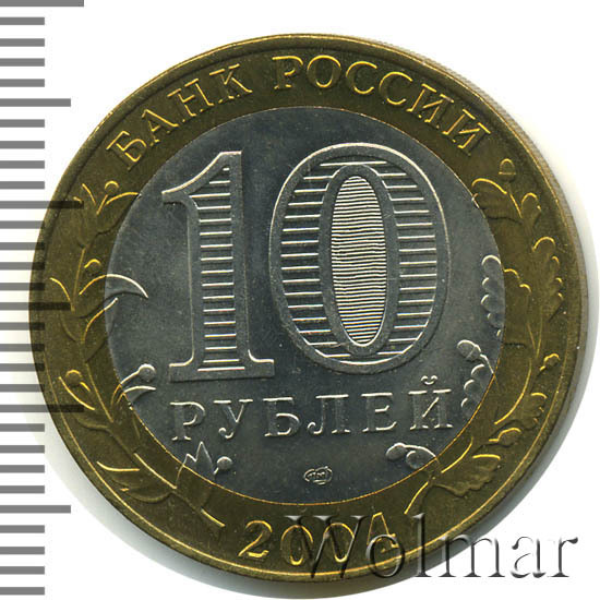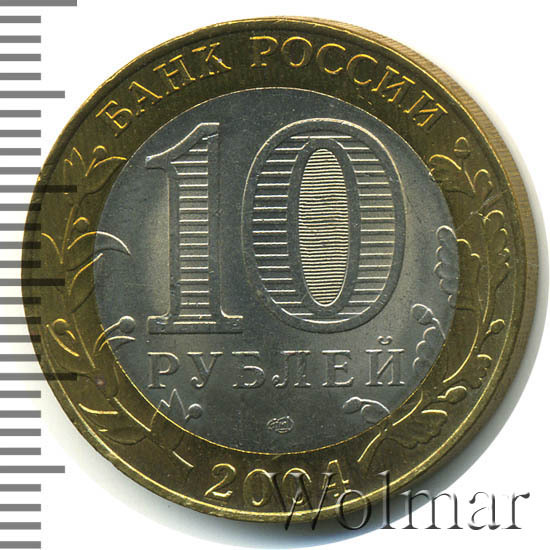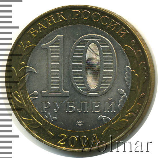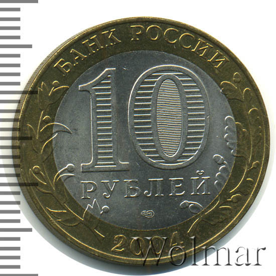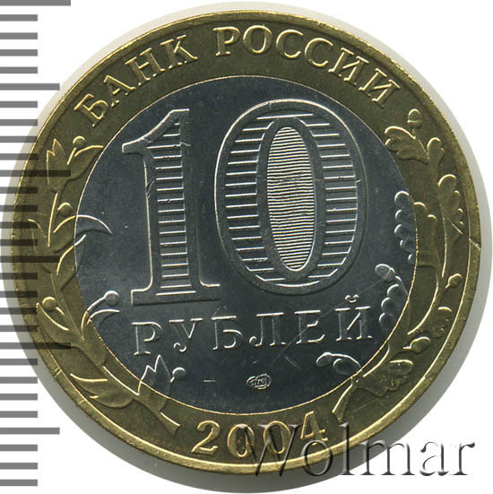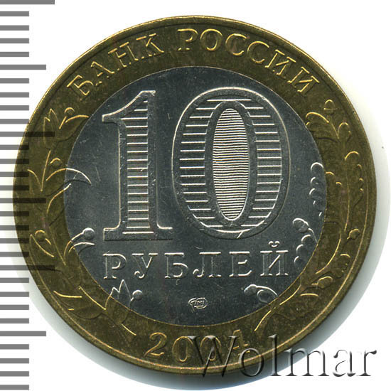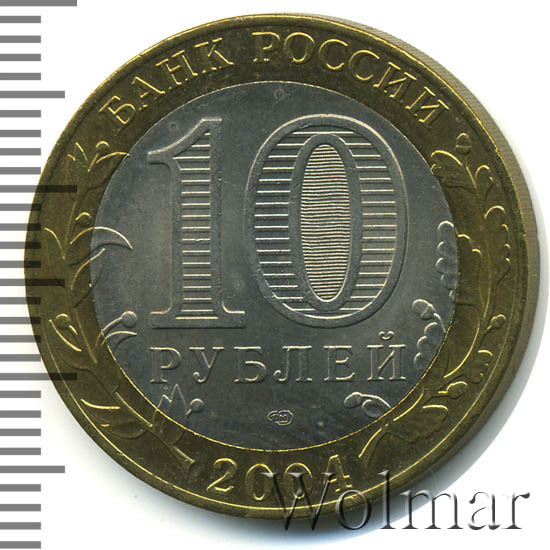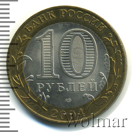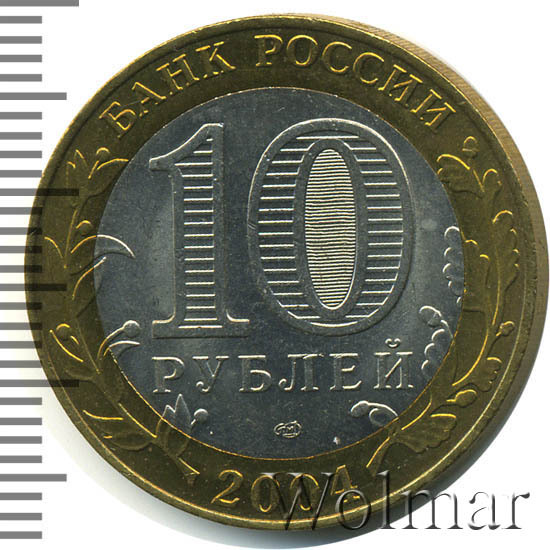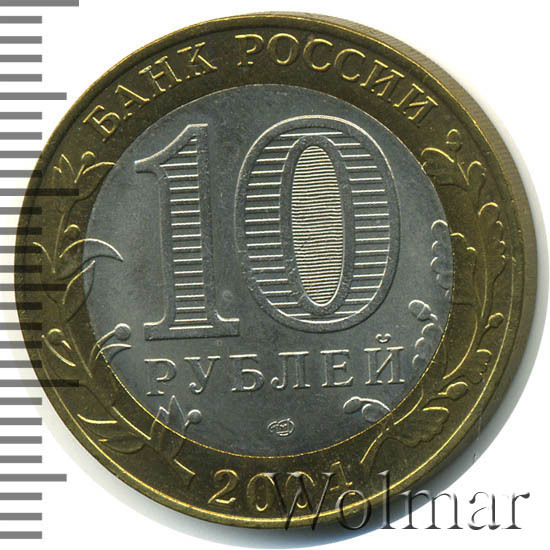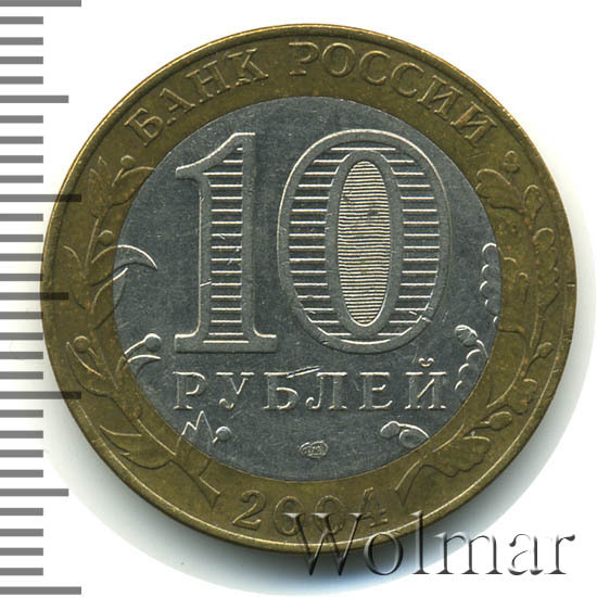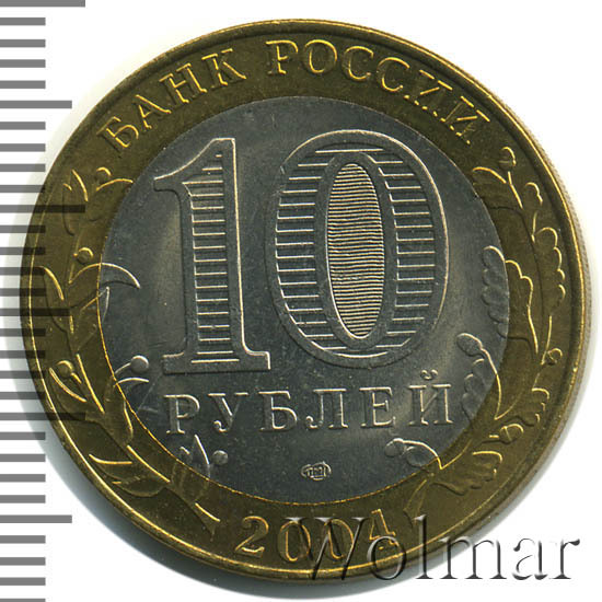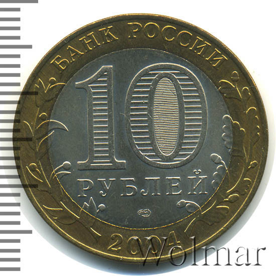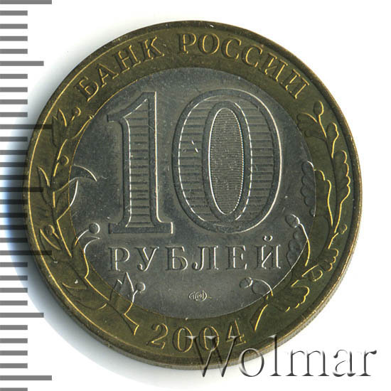 Сверху вдоль края монеты слова «БАНК РОССИИ», внизу год чеканки «2004», слева ветка оливы, справа дуба, обе ветки частично заходят на центральную вставку. В середине номинал «10» под ним слово «РУБЛЕЙ», внутри цифры «0» попеременно видимые при наклоне монеты надписи «10» и «РУБ». Над годом монограмма монетного двора «СПМД».