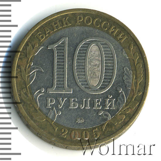 Сверху вдоль края монеты слова «БАНК РОССИИ», внизу год чеканки «2005», слева ветка оливы, справа дуба, обе ветки частично заходят на центральную вставку. В середине номинал «10» под ним слово «РУБЛЕЙ», внутри цифры «0» попеременно видимые при наклоне монеты надписи «10» и «РУБ». Над годом монограмма монетного двора «ММД».