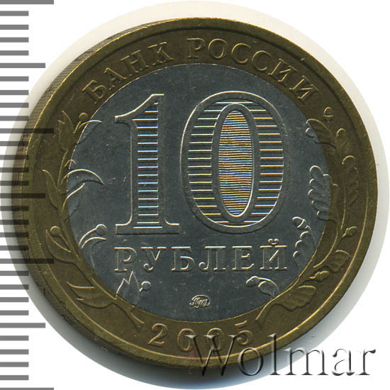 Сверху вдоль края монеты слова «БАНК РОССИИ», внизу год чеканки «2005», слева ветка оливы, справа дуба, обе ветки частично заходят на центральную вставку. В середине номинал «10» под ним слово «РУБЛЕЙ», внутри цифры «0» попеременно видимые при наклоне монеты надписи «10» и «РУБ». Над годом монограмма монетного двора «ММД».